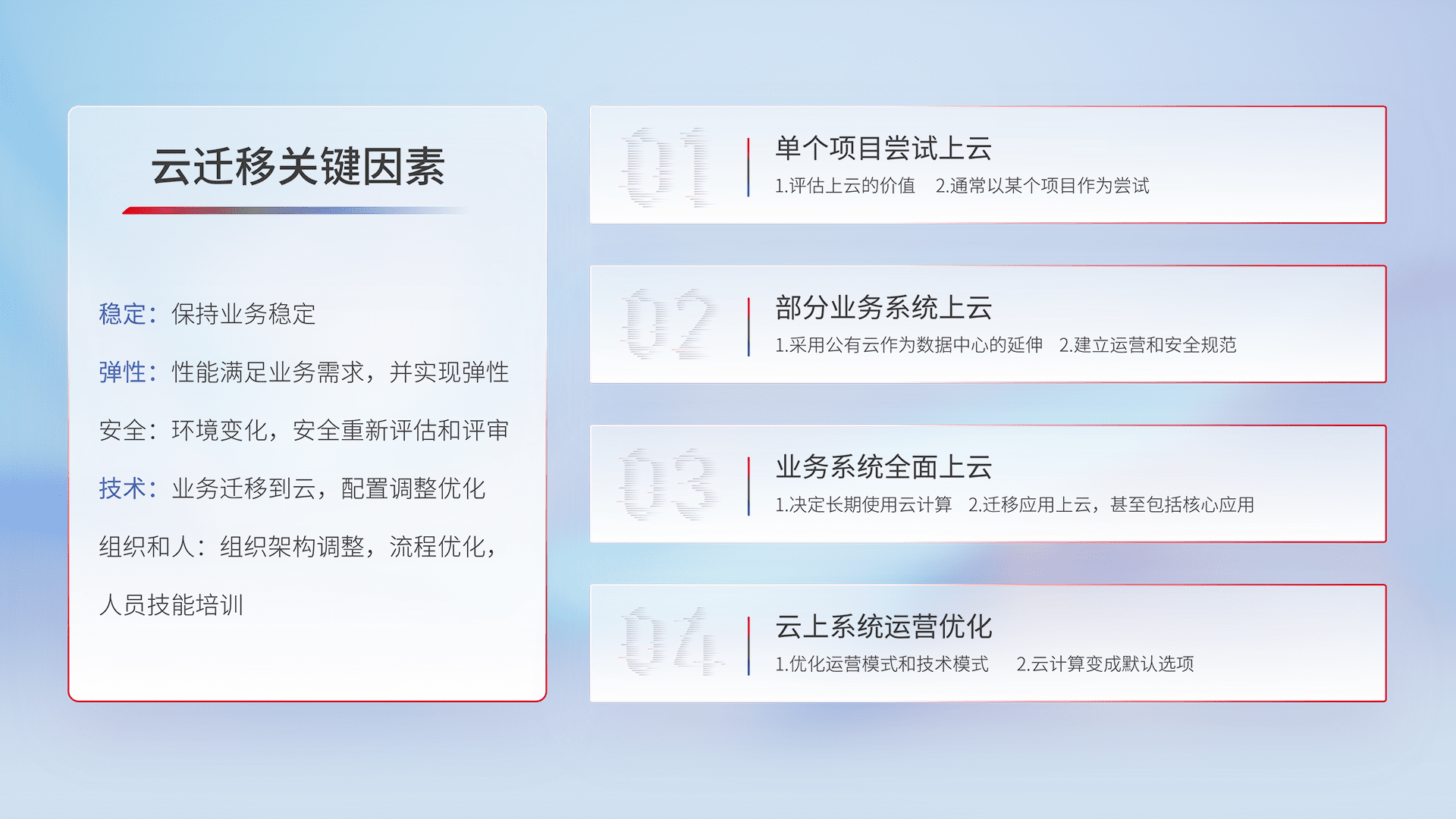结合实际业务,,,,从规划设计、、云平台选型、、、云原生改造、、、、数据迁移、、、、集成交付,,,,迁移全过程为客户识别最佳上云路径,,,做好风险识别管理,,,,设计网络架构、、、身份权限、、安全审计合规、、操作审计、、、日志审计、、、、监控告警策略、、、多站点容灾设计等,,对云上基础设施进行整体规划,,,,提升IT治理水平,,以满足弹性、、、高可用、、、、高性能的需求。。。。