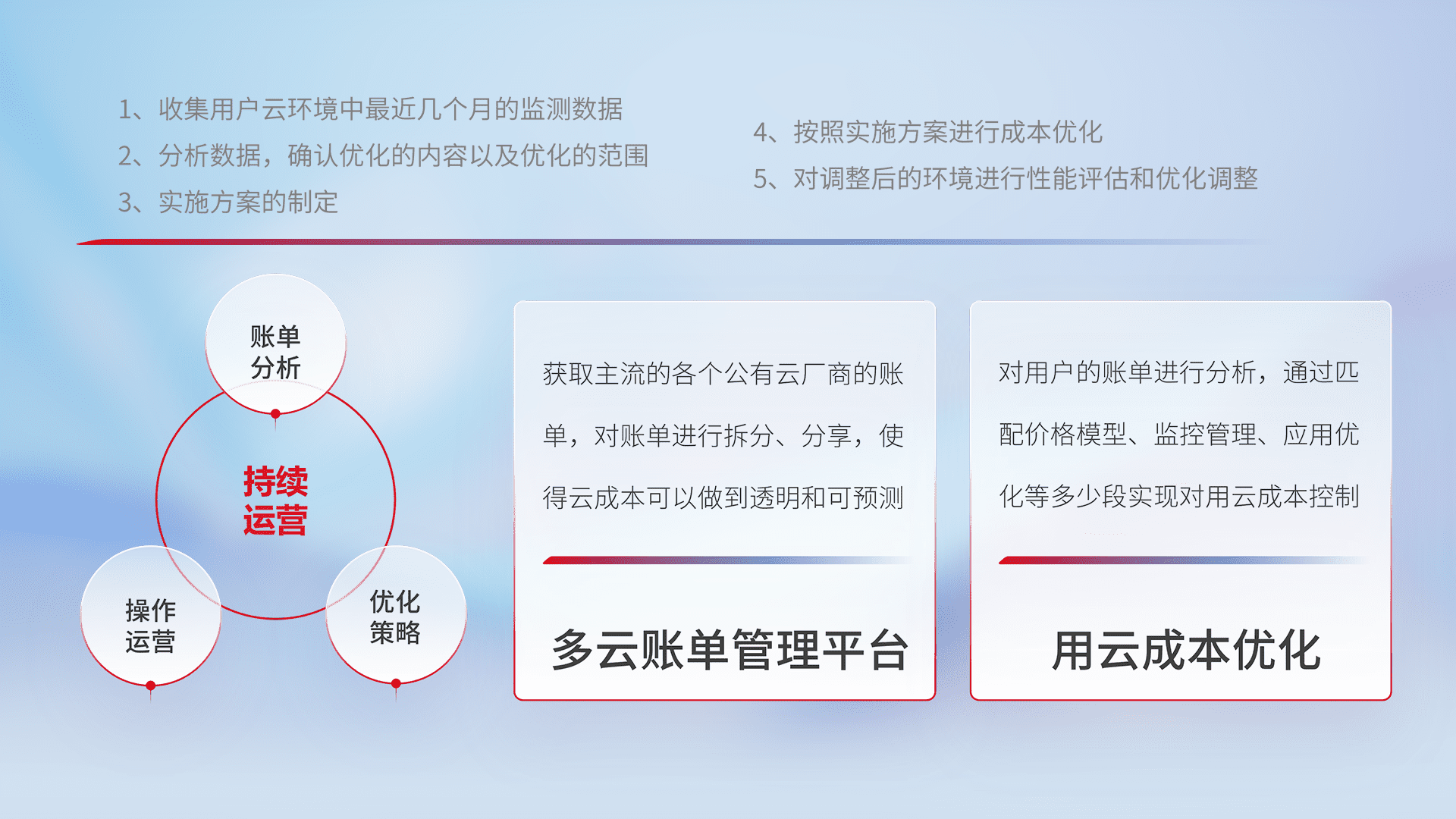通过多云纳管,,,,以统一的资源数据模型把客户的云资源进行抽象和封装,,,,进而实现对多云资源的统一操作,,,,保障云资源管理的可靠性、、、稳定性与可用性。。。量身定制化运维内容,,配置、、、开发运维、、、、补丁管理、、备份、、、监控、、、认证和访问管理、、、审计和日常巡检等,,,,保障在用云过程中的可靠度,,稳定度以及高可用率。。。。