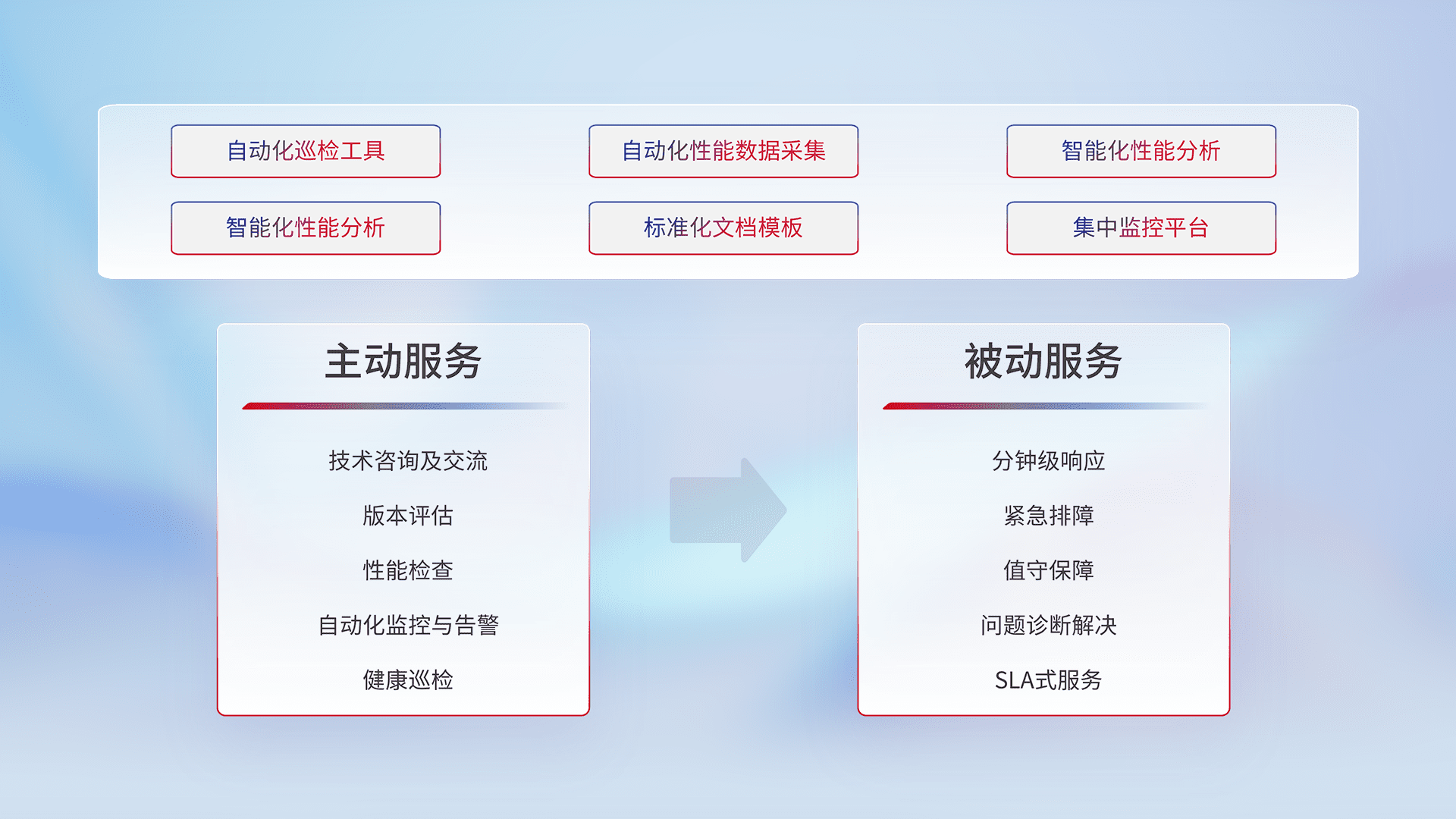 智能化工具和标准化文档,,,保障服务质量,,,,提供主动服务(包含技术咨询、、、版本评估、、、性能检查、、、、自动化监控与告警、、、健康巡检)和被动服务包含(分钟级响应、、、、紧急排障、、、、值守保障、、、、问题诊断解决、、、、SLA服务)。。